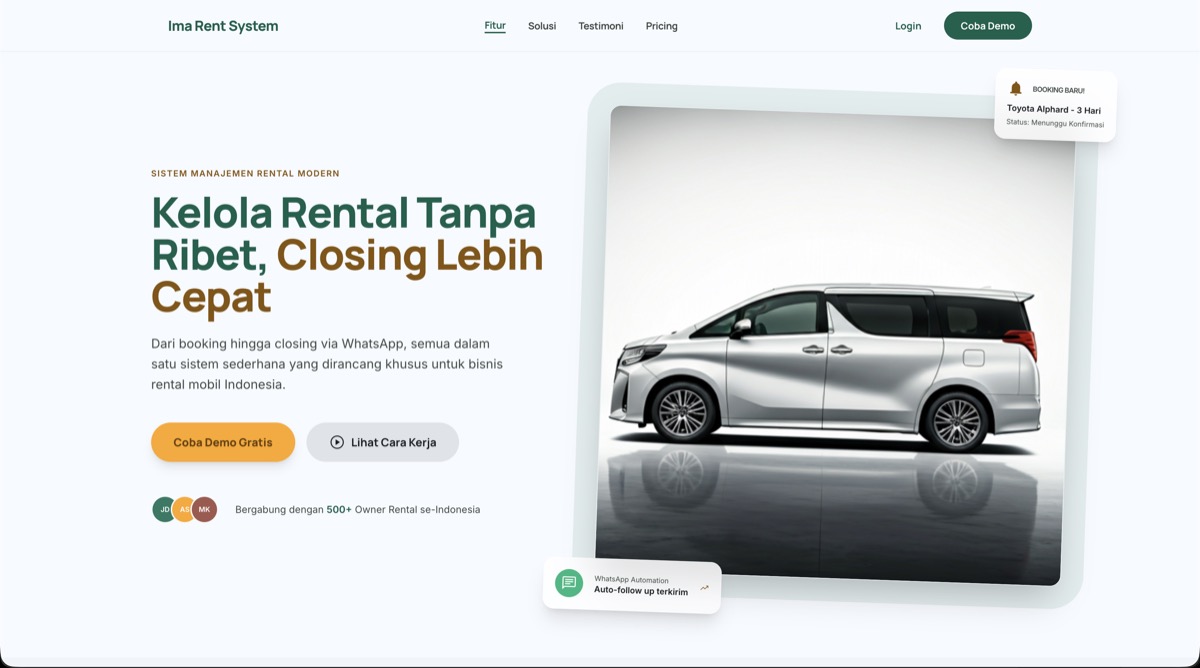 Sistem manajemen rental kendaraan terintegrasi — booking online, fleet tracking, dan laporan operasional dalam satu platform.